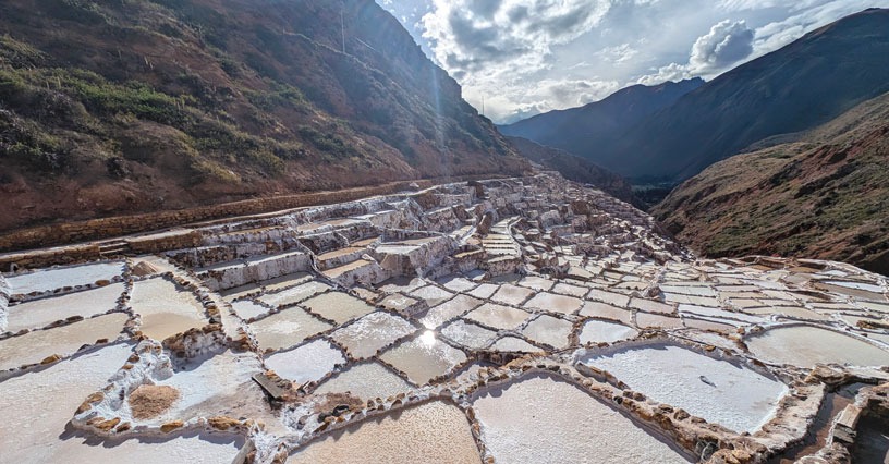 Visit the Maras salt ponds, where thousands of salt pans glisten against the mountain backdrop.